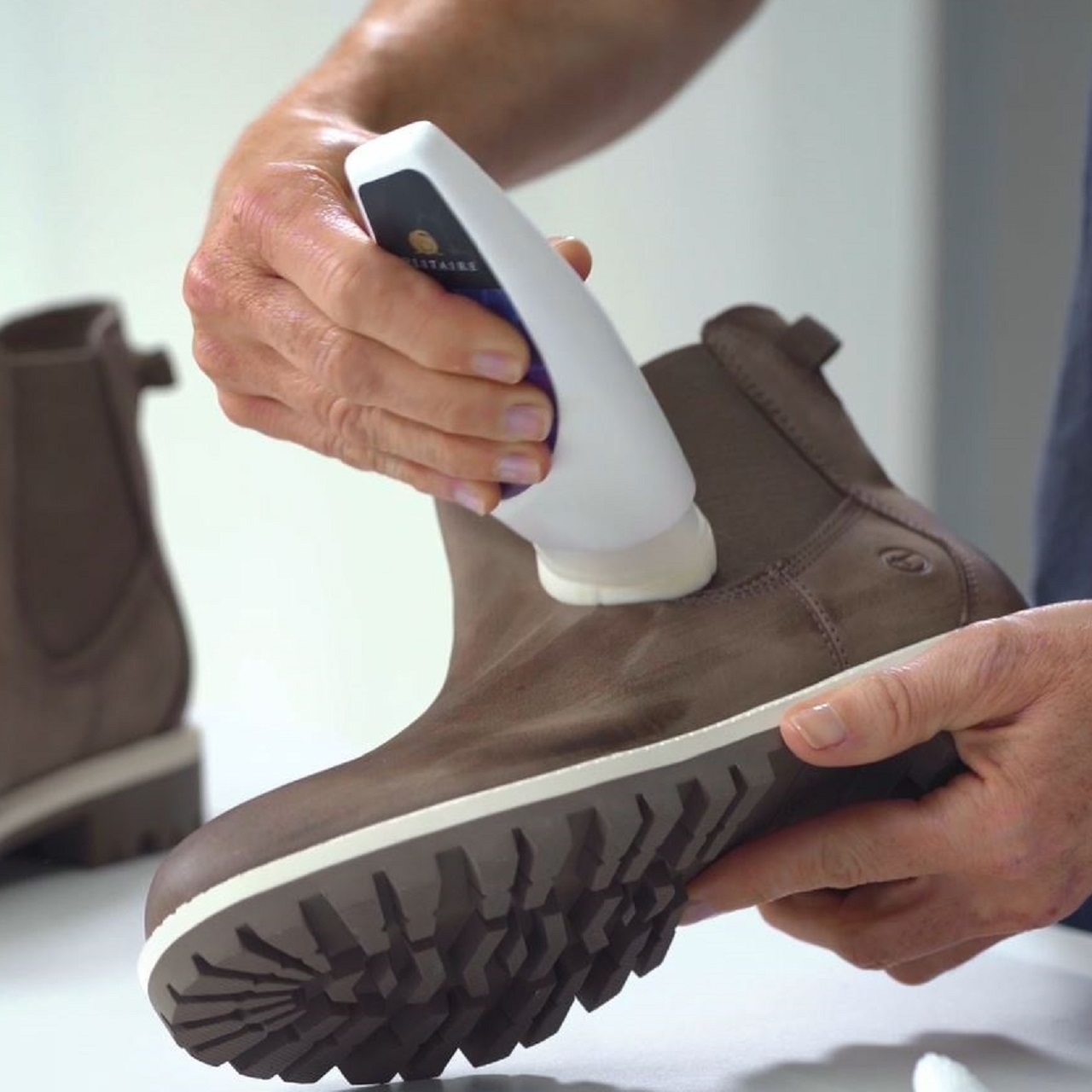 Vor der Anwendung Staub und Schmutz entfernen. Material an einer unauffälligen Stelle (z.B. Innenseite der Ferse) auf Farbechtheit prüfen. Den Schwamm auf der Material aufsetzen und leicht andrücken. Mit wenig Druck gleichmäßig auf dem Material verteilen (tupfend oder kreisend) und gut trocknen lassen. Rauleder ggfs. anschließend sanft aufbürsten.