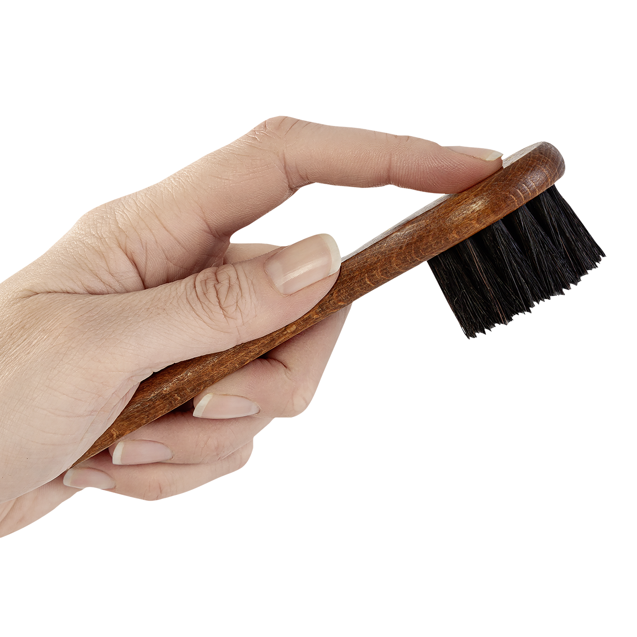 Mit echtem dunklen oder silbergrauen Rosshaar besteckte Auftragsbürste für alle Schuhpflege-Tiegelware. Ideal zum Eincremen aller hochwertigen Lederschuhe.