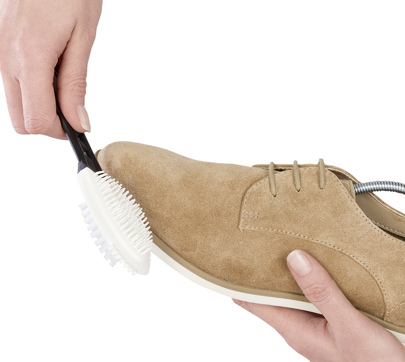 Mit den Messingborsten der Bürste den groben Schmutz vom Leder entfernen. Zum Säubern der Kanten oder Nähte eignen sich die Reinigungskanten an den Seiten der Bürste. Danach das Pflegemittel verwenden und den Schuh gut trocknen lassen. Zum Schluss mit der Rückseite des Gummikopfes das Leder in eine einheitliche Richtung kämmen. Die Bürste kann mit Wasser und Seife gereinigt werden.