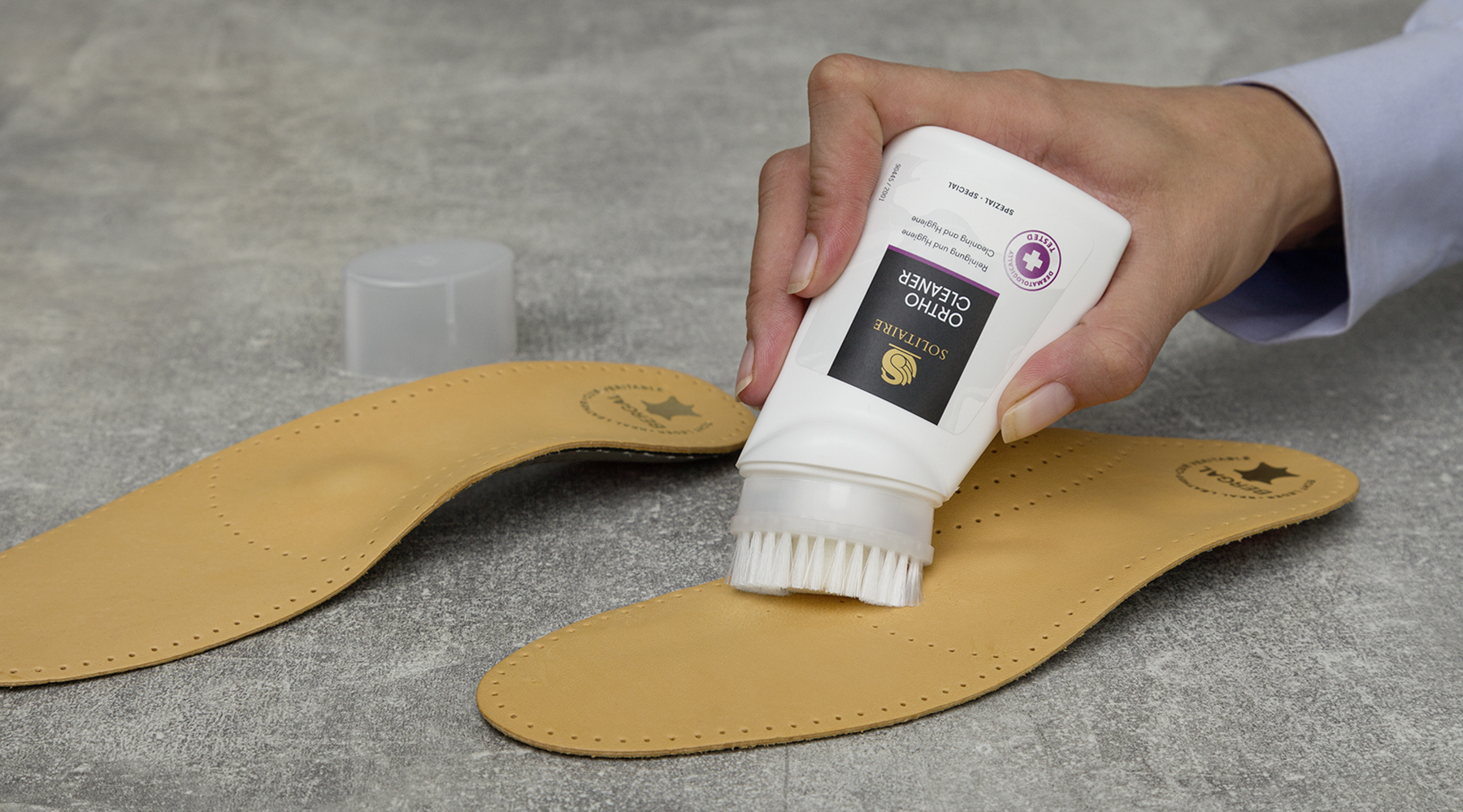 Reinigt orthopädische Schuheinlagen, Gesundheits- und Verbandsschuhe hygienisch rein. Einfach in der Handhabung dank integriertem Bürstenkopf. Dermatologisch getestet und pH-hautneutral. Mit zartem Zitronenduft.