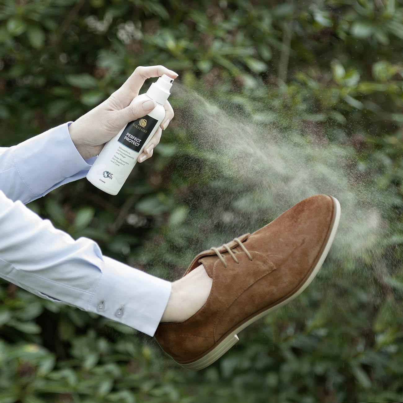 PERFECT PROTECT: Nur auf sauberen Schuhen anwenden. Materialverträglichkeit an einer unauffälligen Stelle prüfen. Aus ca. 30 cm Entfernung gleichmäßig und dünn einsprühen. Nicht durchnässen. WICHTIG: Emulsion nach kurzer Einwirkzeit mit einem Mikrofasertuch sanft verteilen. Trocknen lassen. Für optimalen Schutz Behandlung wiederholen.