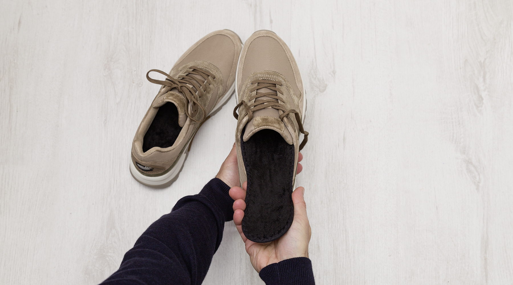 Wenn möglich, den Schuh aufschnüren/öffnen, um die Sohle einfacherer in den Schuh zu legen. Sofern die vorhandene Sohle nicht verklebt ist, bitte entfernen. Die Einlegesohle mit dem weichen Kunstfell nach oben in den Schuh legen, sodass die graue Grip-Latex-Schicht nach unten zeigt. Gegebenenfalls beim Einschieben in den Schuh, die Sohle der Länge nach leicht zusammendrücken. Die Sohle kann nach dem Tragen zur Belüftung nach Belieben herausgenommen werden.